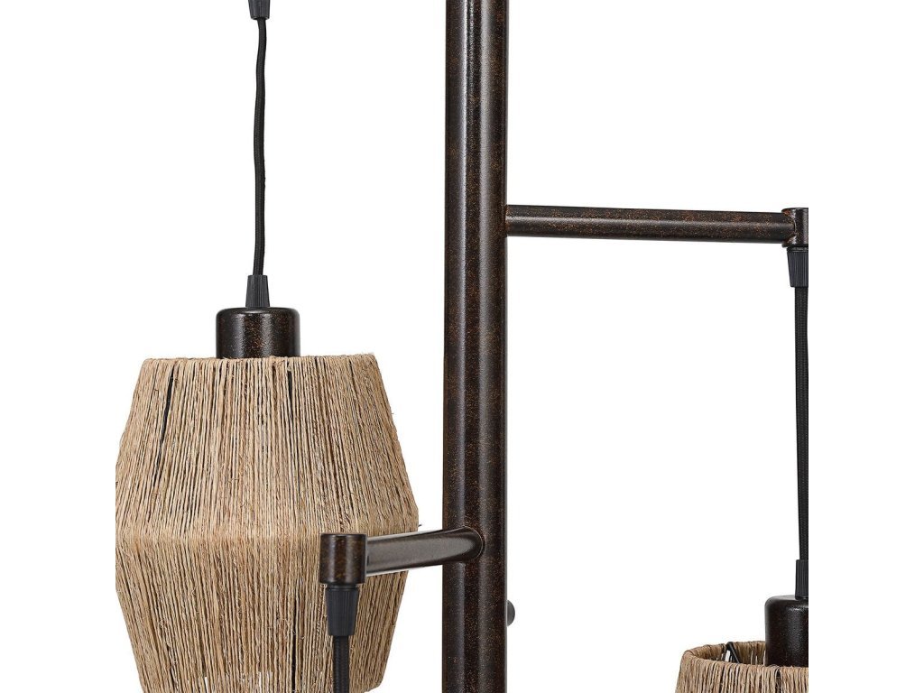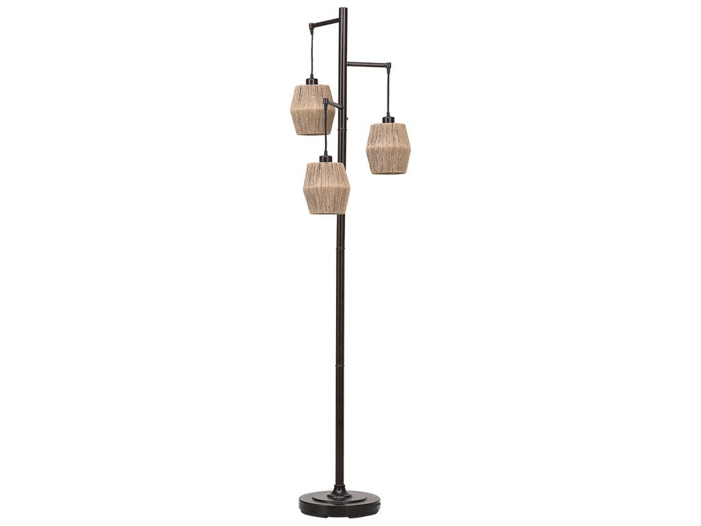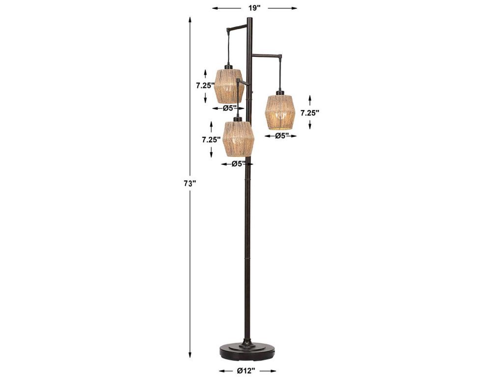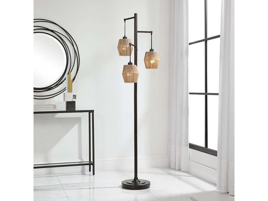 Product Description This unique floor lamp is the perfect choice if you are looking for something extra special. The beautiful oil rubbed bronze finish with gold highlights is enhanced by three drum shaped shades. The shades are constructed with tightly strung narrow rope and provides the perfect amount of light. This is sure to be a conversation piece.