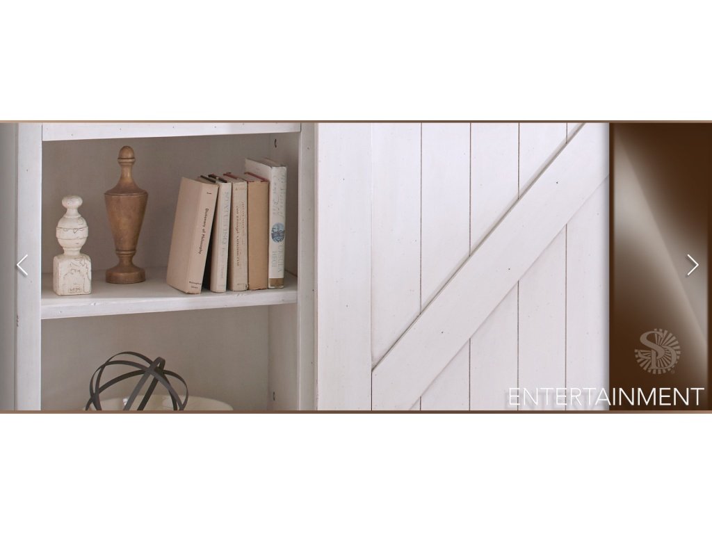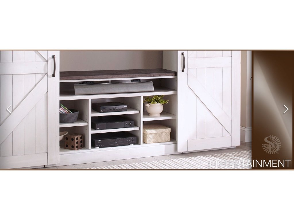 • Mahogany and mindi solids and veneers Framed and planked X barn door design Sliding barn door hardware for easy opening and closing Adjustable shelves and ample storage options European Cottage finish |