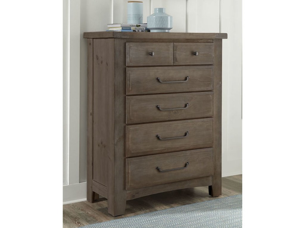 Product Description Transitional styling and a slight rustic charm combine to create the simple, yet attractive look of this five drawer chest of drawers. Antique pewter finished hardware elevate the vintage look of this piece, bringing a feeling of comfort and belonging into your bedroom.