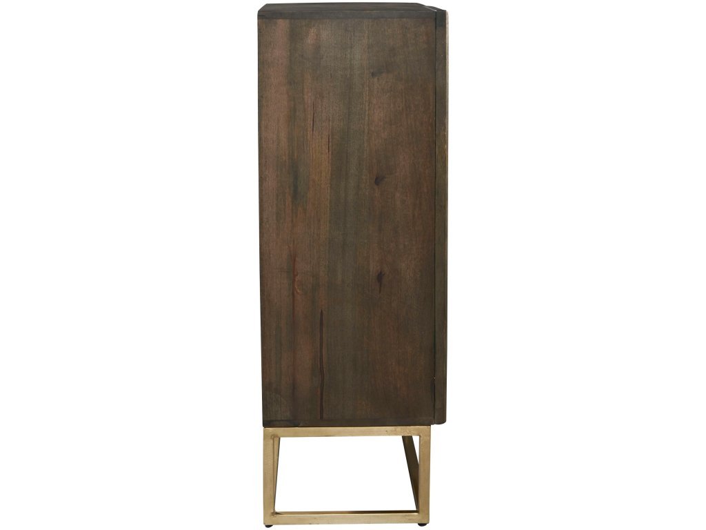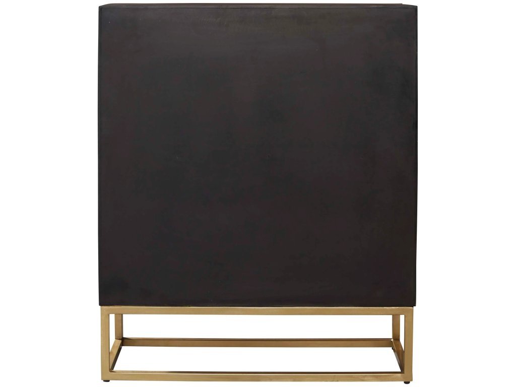 • The cabinet has one shelf with brass legs and hardware.