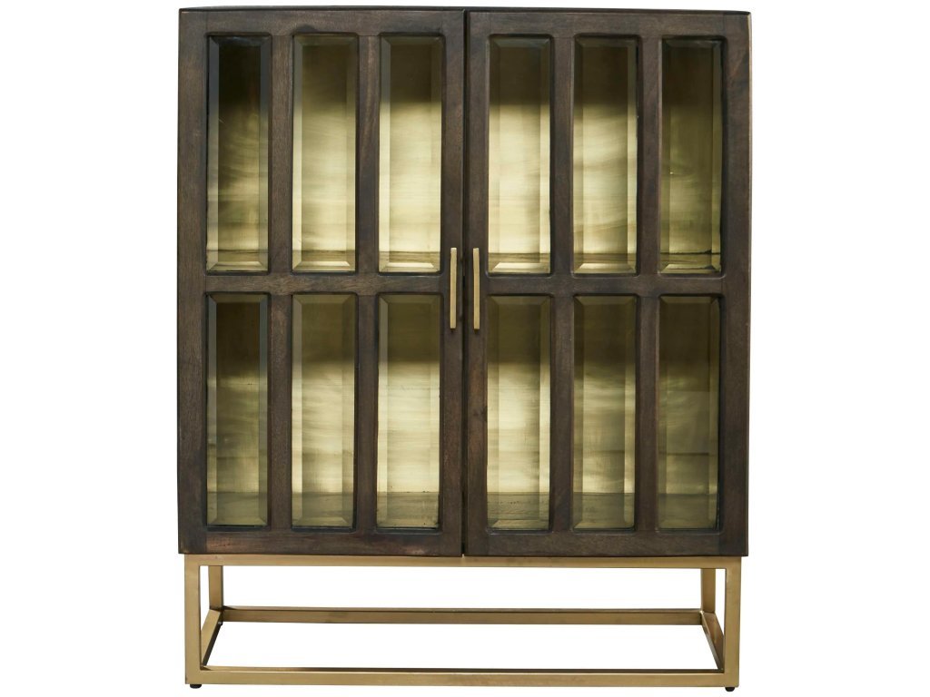 • Two-door chest with 12 panels of beveled glass showing a brass back panel.