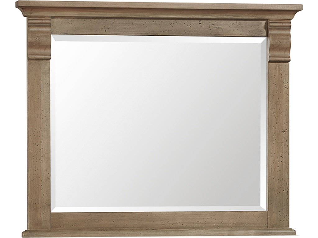 Product Description: Complete your bedroom collection by placing this mirror on top of your dresser or chest. Featuring a frame crafted from solid wood and beveled glass; this mirror captures the perfect mix of traditional and rustic style. Bleached grey tones are reminiscent of sunbaked driftwood.