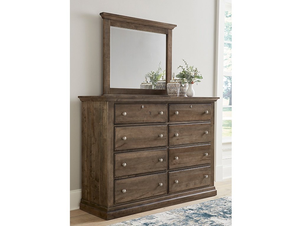 Product Description Complete your bedroom collection by placing this mirror on top of your dresser or chest. Featuring a frame crafted from solid wood and beveled glass; this mirror captures the perfect mix of traditional and rustic style.