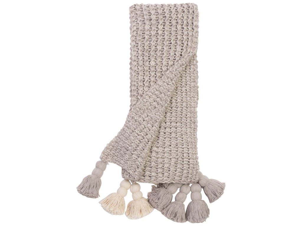 Product Description The luscious Lawrence Throw is made of soft 100% cotton and is the definition of comfort! Hand-knitted with double tassels on each corner, this chunky throw will give your space a warm, inviting feel. Available in 2 colorways: Natural and Grey.