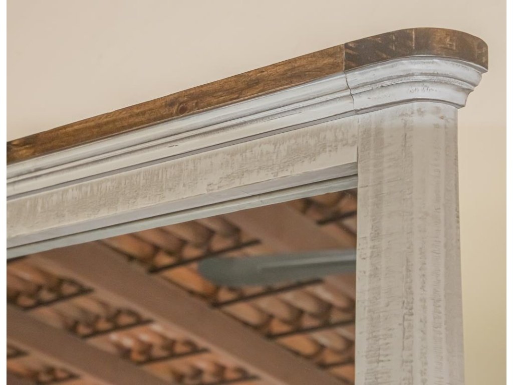 Finish is achieved through a multi-step lacquer in a weathered gray, with natural brown tops.