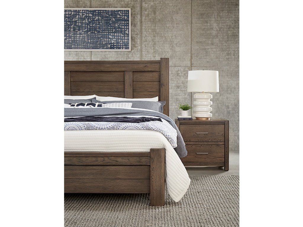 Vaughan Bassett has developed ATAP (Accelerate The Ageing Process) a process that allows them to accelerate how wood ages. We have kept the splits; knots; cracks; and the bold grain pattern found in Oak lumber to create this reclaimed look in this beautiful and unique bedroom
