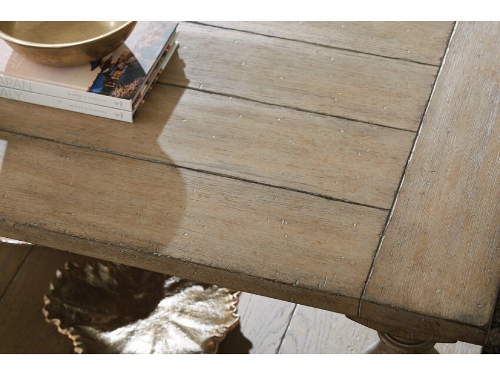 Product Description: The Donelson Coffee Table has an exaggerated scale with transitional styling in a rich timeworn finish. It features heavy baluster legs, a planked top with breadboard ends, a planked shelf, bracket feet and removeable casters for easy mobility. Some assembly required.