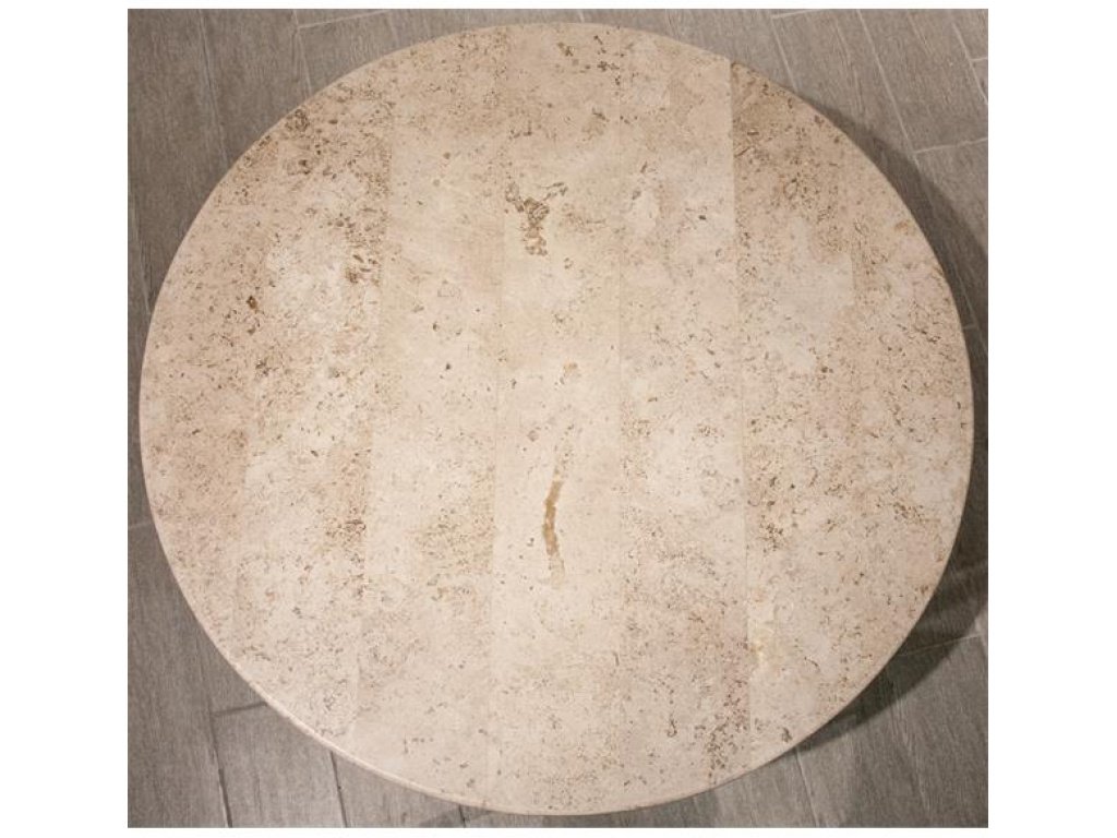 The travertine top is not a solid slab but is composed of a marine plywood core which thin pieces of stone that are laminated to the core like tile