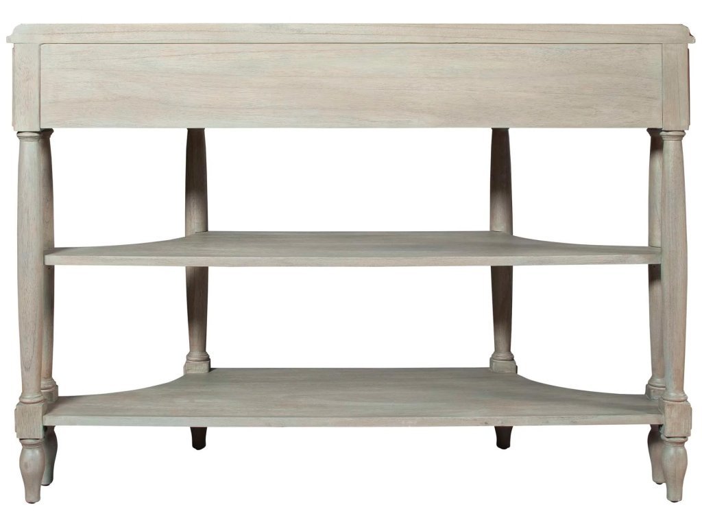 • The case has a single center drawer with two faux side drawers above two shelves for ample storage.