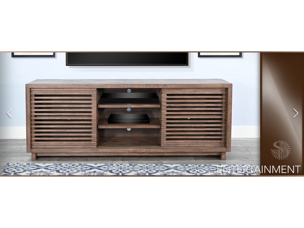 Discover our sleek media console, expertly crafted from mahogany solids and veneers. Designed for modern living, it features cord management, adjustable shelves, and two sliding doors with wooden slot panels. The Buckskin finish adds a touch of sophistication to your entertainment space. |
