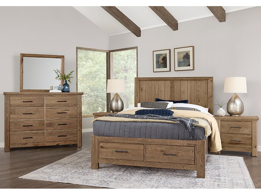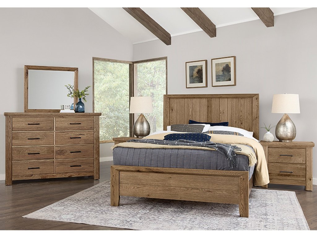 Vaughan Bassett has developed a patent-pending process that allows them to accelerate how wood ages. We have kept the splits; knots; cracks; and the bold grain pattern found in Oak lumber to create this reclaimed look in this beautiful and unique bedroom